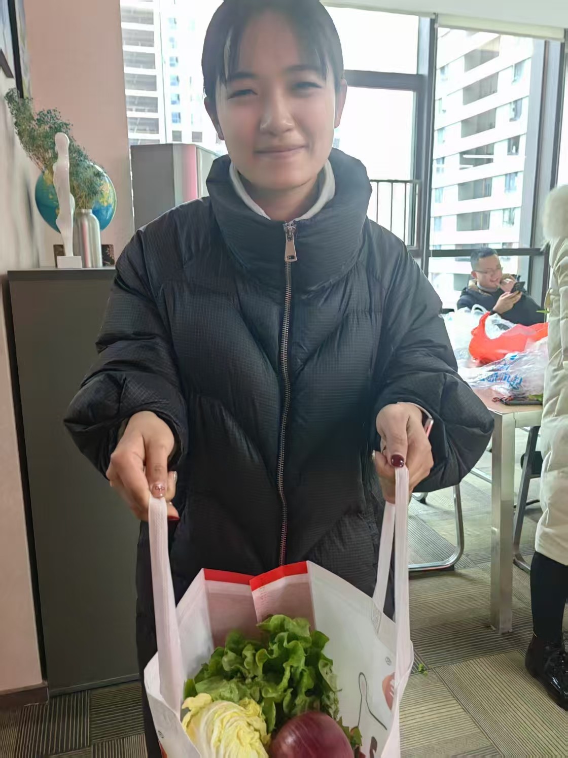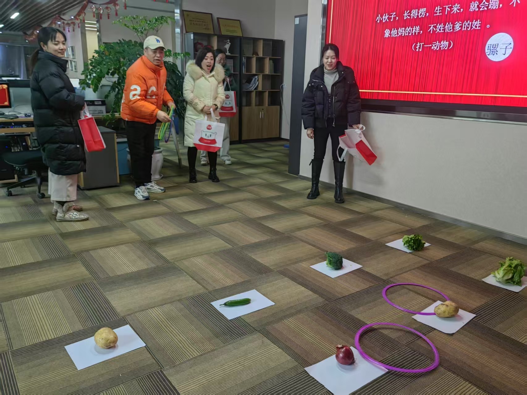 成功猜出謎底,便獲得了參與套蔬菜活動的資格。每人手持10個圈,站在指定位置,瞄準心儀的蔬菜,輕輕拋出手中的圈。只見圈圈在空中劃出一道道優美的弧線,精準地套中蔬菜的瞬間,歡呼聲和掌聲此起彼伏。套中的蔬菜可以直接拿回家,這不僅是一份收獲,更是一份節日的喜悅。大家在活動中盡情享受著游戲的樂趣,辦公區里充滿了歡聲笑語,仿佛將所有的疲憊都一掃而空。